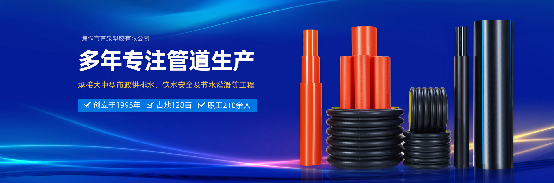 -   焦作市富泉塑膠有限公司,創立于1995年,是一家集研發、設計、生產、銷售為一體的大型管材企業。公司位于太極故里、黃河之濱一一河南焦作溫縣。公司占地128畝,現有職工210余人,其中具有中技術職稱的19人。生產、檢驗設備58臺(套),包括PVC實壁管生產線11套、PE實壁管生產線12套、HDPE雙壁波紋管生產線6套、PVC雙壁波紋管生產線5套,檢驗設備14臺(套)。主要產品有:Φ20mm-630mm、各種壓力規格的PVCU、PVC-M、PE給水管材,PVC-U節水灌溉管材,HDPE燃氣和礦用管材,DN200-800mm的HDPE、PVC雙壁波紋管及各種噴灌、滴灌工程材料。承接大中型市政供排水、飲水安全及節水灌溉等工程。  富泉塑膠公司重視產品的質量、安全、環保和節能,在同行業中率先完成了“新華節水產品認證”,全方面通過ISO9001:2008國際質量管理體系、IS014001:2004環境管理體系和OHSAS18001職業健康安全管理體系的一體化導入,并建立起規范的現代企業管理體系。公司以“質量”為先導,采用質量跟蹤、多環節把關的方法,組建具有行業水準的企業技術檢測中心,常年委托水利部節水灌溉設備檢測中心、河南省產品質量監督檢驗院對產品跟蹤檢測,并由中國人民保險公司承保產品質量。公司連續多年被河南省水利廳確定為“安全飲水設備、節水灌溉設備”定點生產企業,并獲得“中國名優產品”“質量、服務、信譽AAA企業”“河南省**產品”“河南省水利企業”“河南省守合同、重信用企業”等榮譽稱號?! 「蝗苣z公司堅持“用戶為上”的服務理念,長期以來,全方面關注客戶價值,不斷提升服務水平。服務隊伍常年為客戶的產品設計、施工、安裝提供合理的方案和全程細致、周到、**、快捷的技術服務。公司自成立以來,一直堅持以人為本的宗旨,塑造企業形象,并致力于新產品的開發,憑借雄厚的技術開發能力,先進的工藝制造流程,嚴格的質量管理保證體系,優良的售后服務網絡,已成為河南省大的飲水、灌溉及排水管材設備制造商。產品暢銷全國,而且還以公司雄厚的綜合實力在業界中占據著重要的地位。